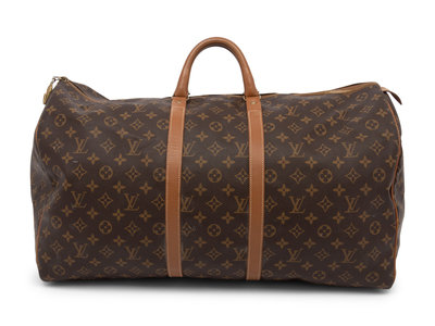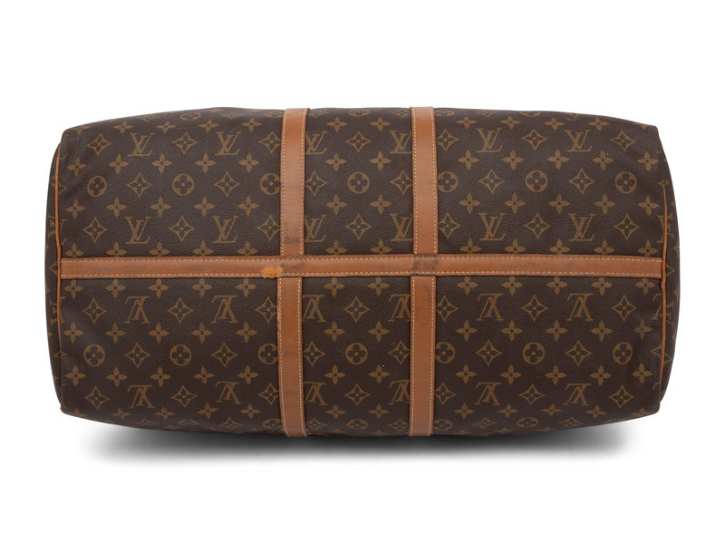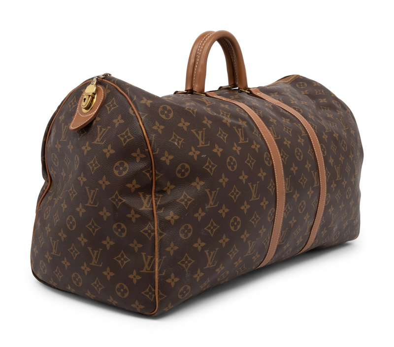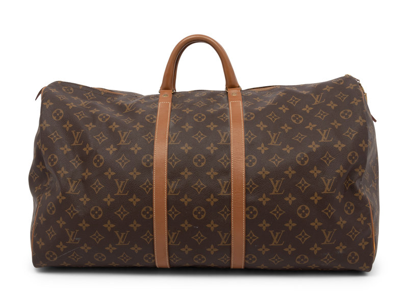 Dual brown monogrammed coated canvas Keepall bag with light brown leather trim, two rolled top handles, and a single interior compartment with a top zipper closure.