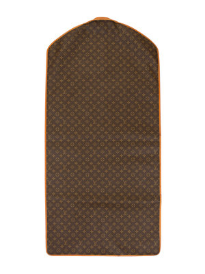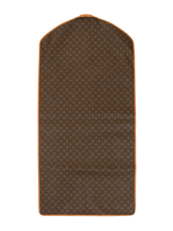 Dual brown monogrammed coated canvas garment bag with light brown leather trim and a front zipper closure.