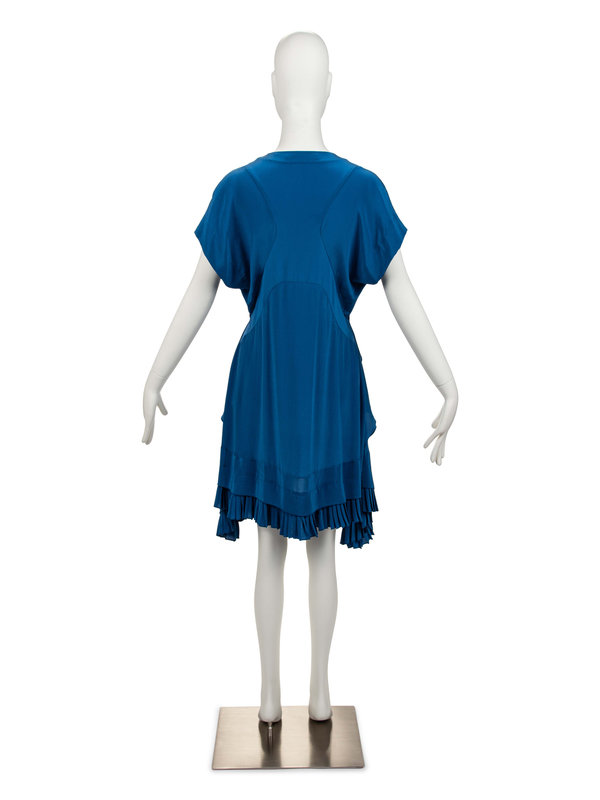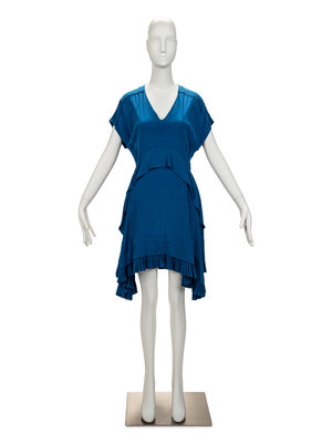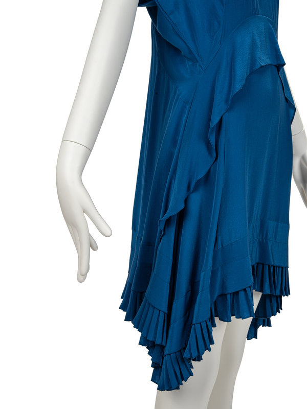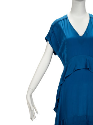 Blue silk flared dress with v-neckline, raglan sleeves, tiered and pleated hem, and two front cascading ruffles.