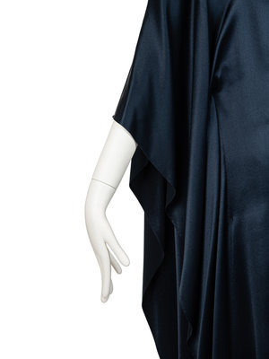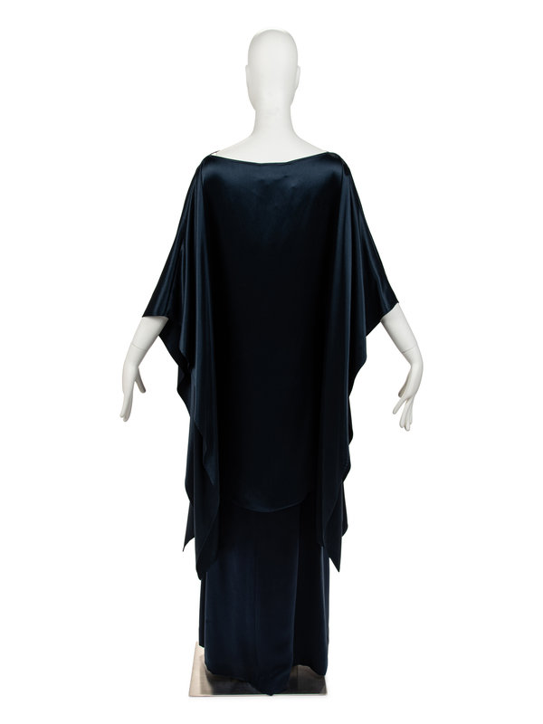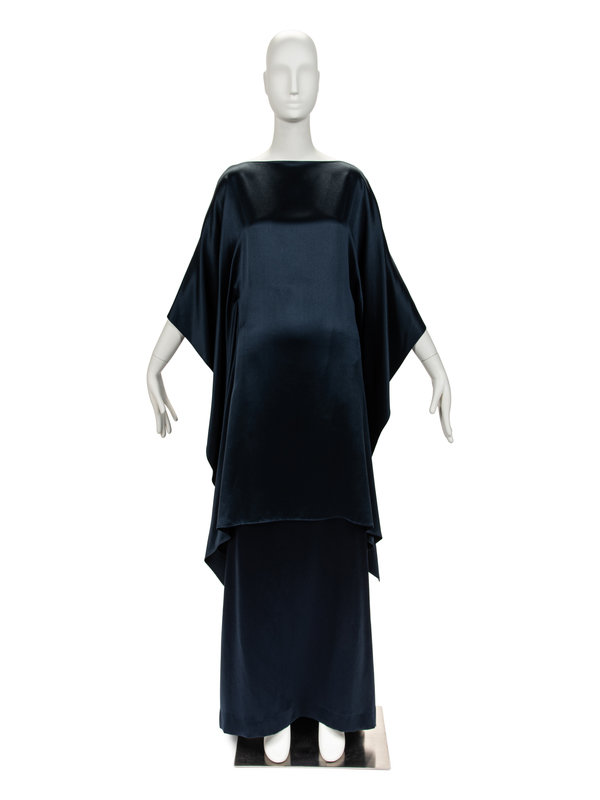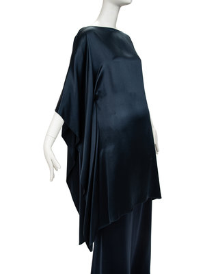 Blue satin poncho fitted at the side seams, bateau neckline, and asymmetrical hem; paired with matching long skirt with pleated back waistband.