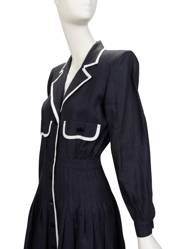 Blue linen dress with notched lapel, set in long sleeves, two front flap pockets, waist band and pleated skirt, white trim detail, detachable white underlay for the v-neck, and front button closure.