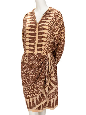 Brown and tan abstract printed blouse with spread collar, set in drop long sleeves, and front button closure; paired with matching wrap skirt.