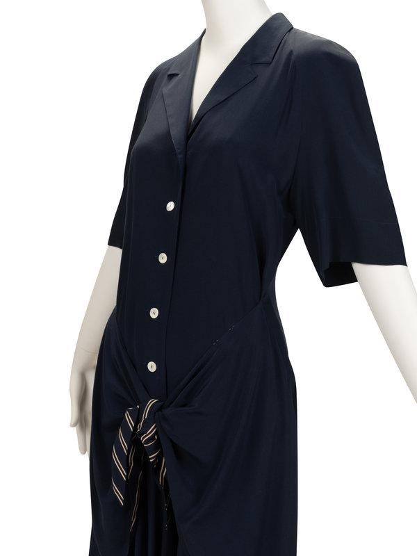 Blue silk dress with notched lapel, short raglan sleeves, front skirt tie with cream striped detail, and front button closure.
