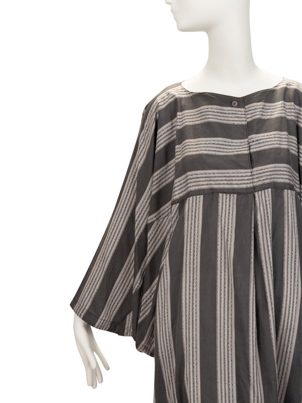 Dual grey striped silk caftan with crew neckline, kimono sleeves, two side slit pockets, and single top button.