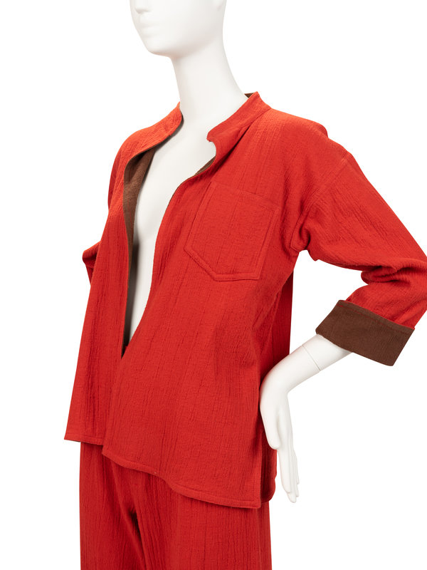 Red cotton jacket with brown cotton lining, mandarin collar, set in long sleeves, single patch pocket, and open front; paired with matching reversible wrap skirt and red cotton pants.