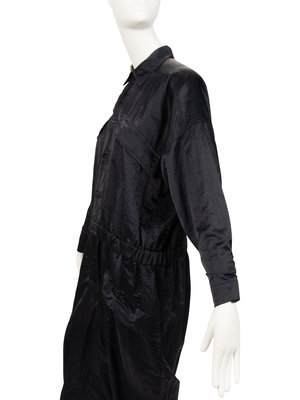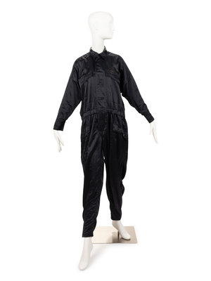 Black nylon jumpsuit with standard collar, dropped long sleeves, four front flap pockets, elastic waist band, and front velcro closure.