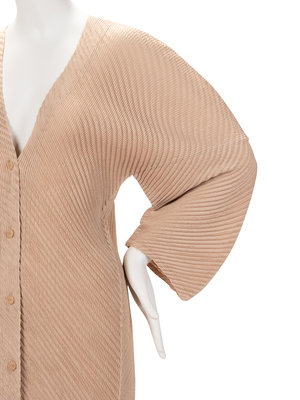 Beige polyester pleated jacket with long rounded sleeves, v-neckline, and front button closure.