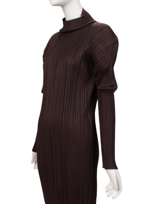 Dark brown long polyester pleated dress with long sleeves and turtleneck.