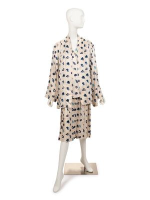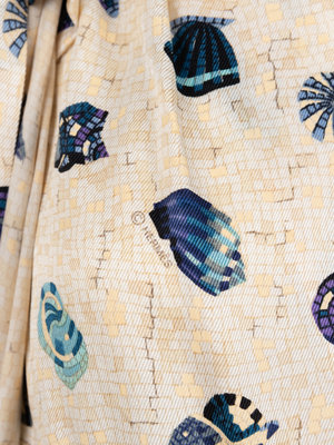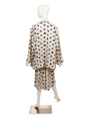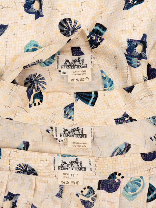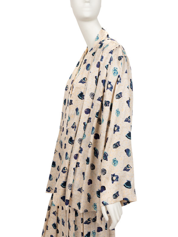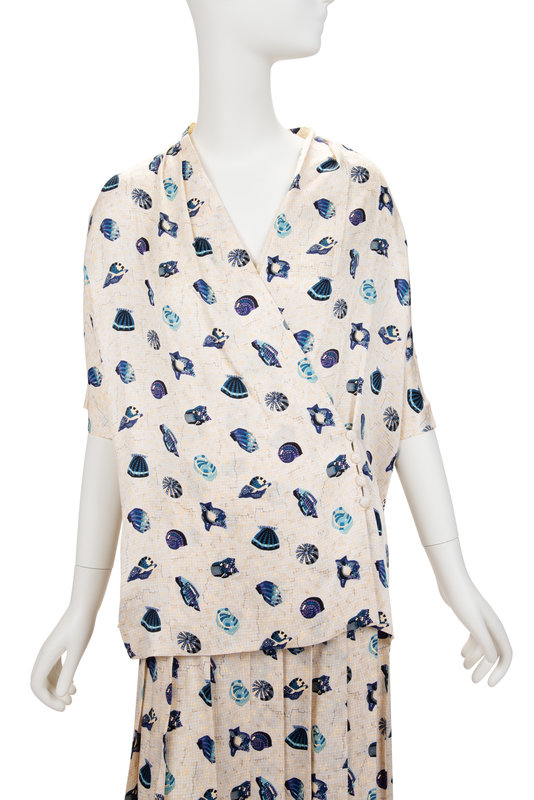 Cream mosaic shell print silk wrap blouse with v-neck, dropped short sleeves, pleats down the front chest, and off center front button closure; paired with matching long sleeve open front jacket, and pleated midi skirt.