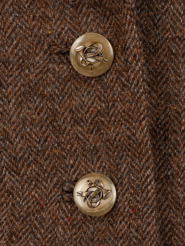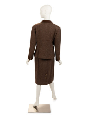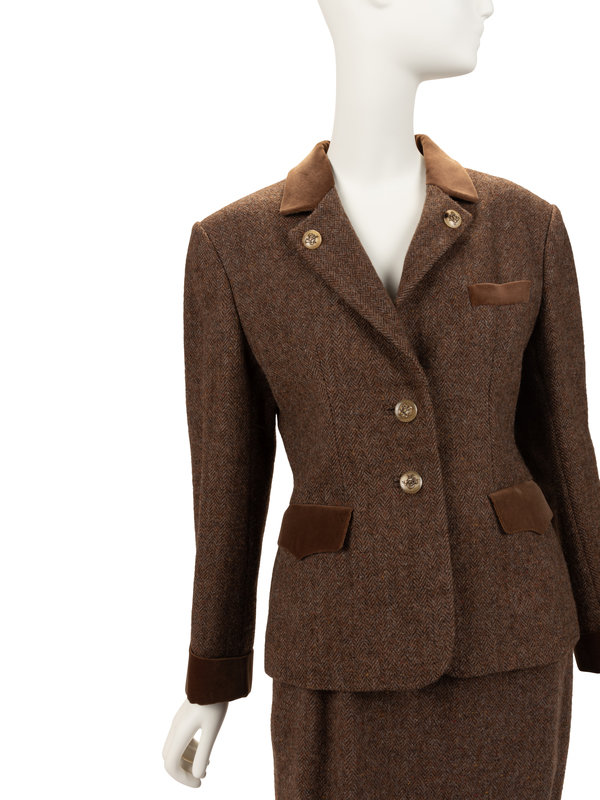 Brown single breasted tweed jacket with notched lapels, brown velveteen trim, two front flap pockets, one welt pocket, and front button closure; paired with matching midi skirt with buttoned back vent and back zipper closure.