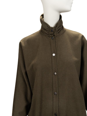 Green wool dress with gathered high collar, long sleeves, and half front button closure.