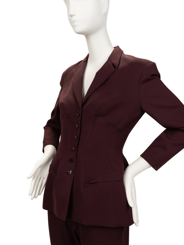 Burgundy single breasted tailored wool jacket with notched lapel, set in long sleeves, two faux flap pockets, peplum skirt, and center front snap closure; paired with matching wool pants.