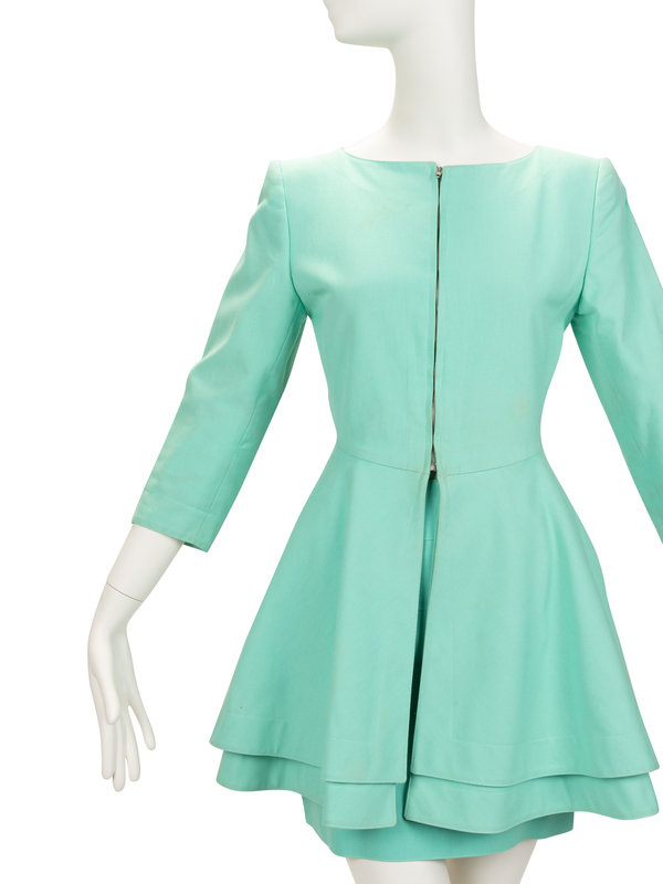 Teal cotton peplum jacket with wide neckline, set in long sleeves, and half front zipper closure; paired with matching paneled mini skirt.