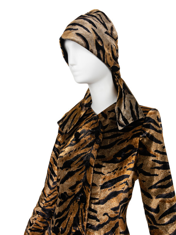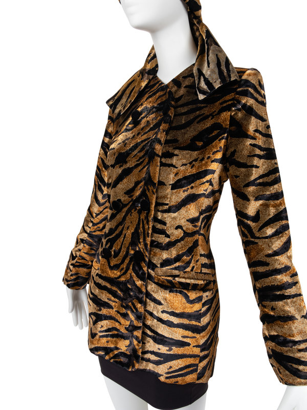 Velvet tiger stripe double breasted jacket with set in long sleeves, two front hip double welt pockets, and front closure of double row of black velvet buttons; paired with matching tiger stripe and black velvet reversible scarf.