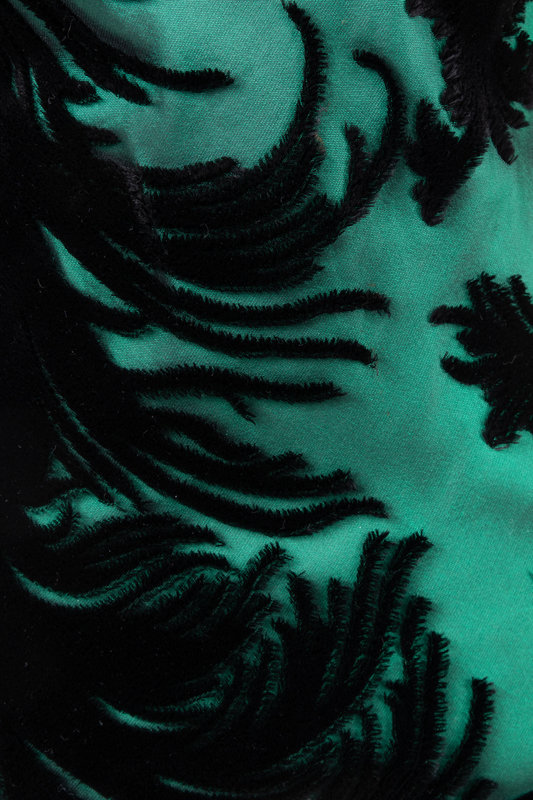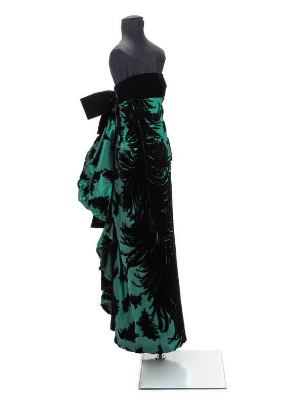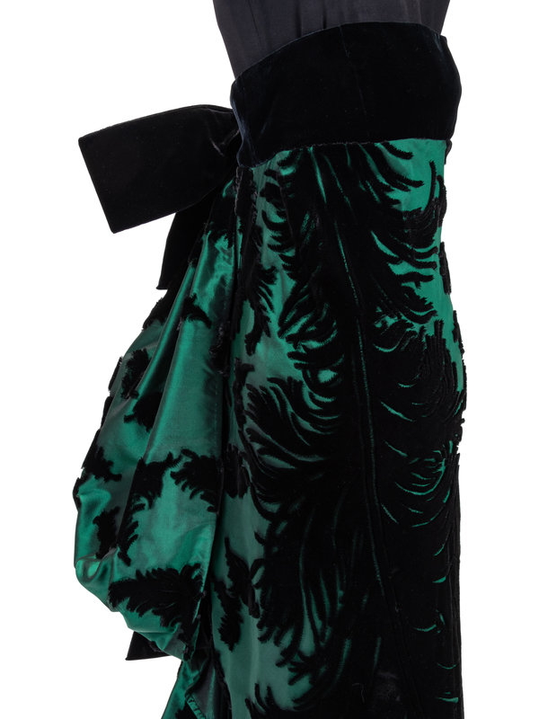 Black and green voided velvet strapless long dress with black velvet chest and bows, center back draped detail, and zipper closure.
