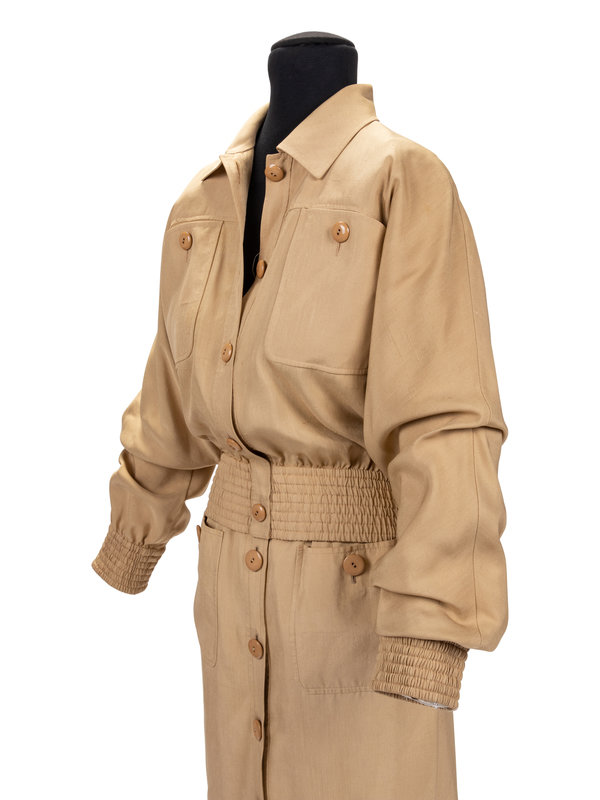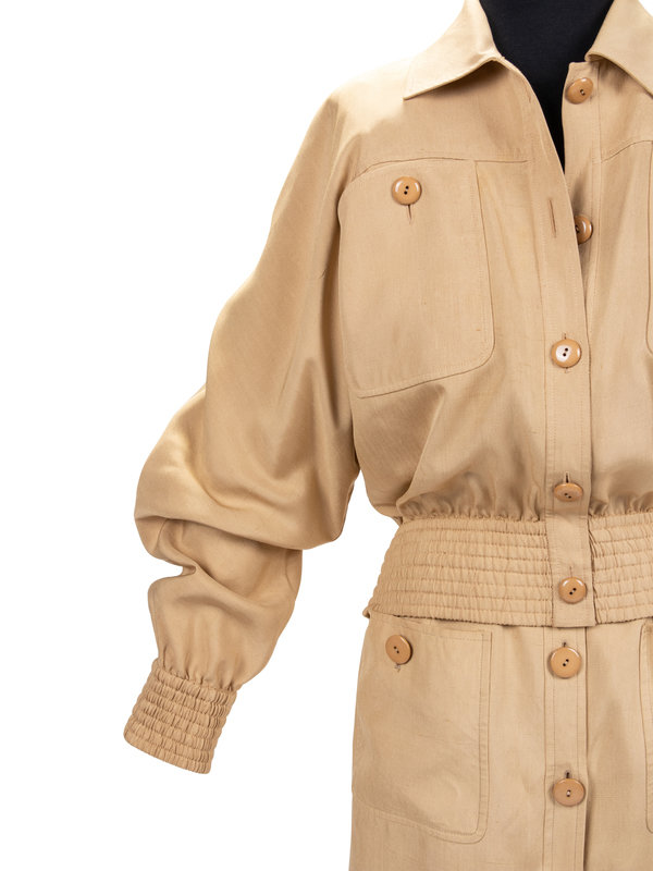 Slubbed tan woven top with spread collar, raglan long dropped sleeves, two front button patch pockets, gathered elastic hems, and half center front button closure; paired with matching mini skirt containing two patch pockets and center front buttons.