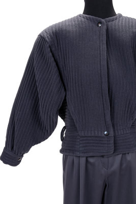 Grey wide wale corduroy jacket with crew neckline, set in dolman long sleeves, two front hip slit pockets, and center front snap closure; paired with grey wool pleated pants with two front hip welt pockets, pleated waist band, stacked D-ring belts, and front zipper closure.
