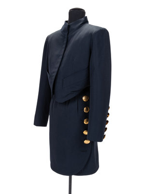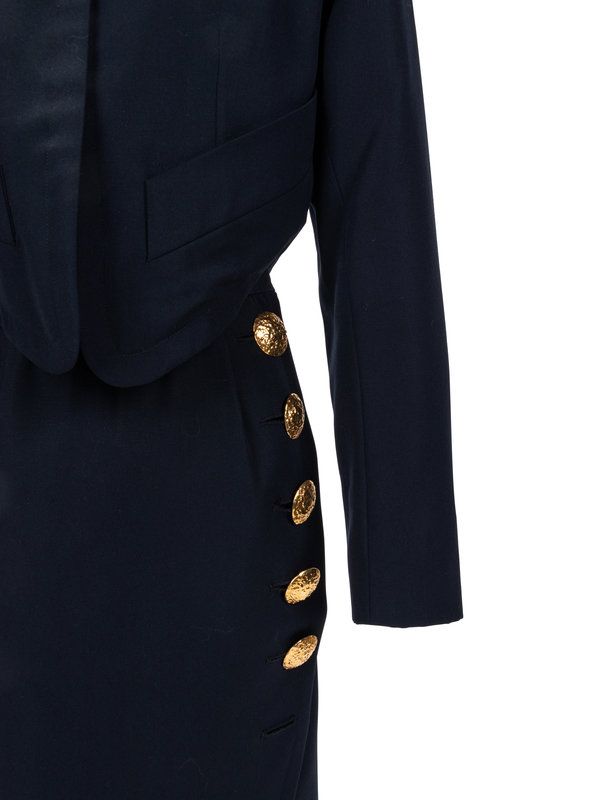 Dark blue wool military style cropped jacket with high collar, set in long sleeves with gold-tone buttons at hem, uneven hemline, two slanted single welt pockets, and single hook and eye front closure; paired with matching wool wrap skirt with off-center gold-tone button closure.