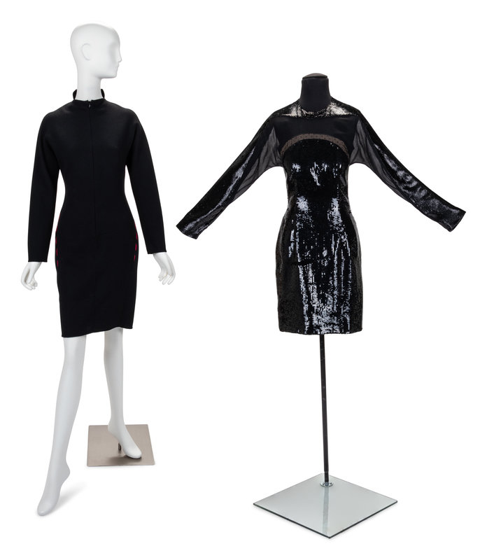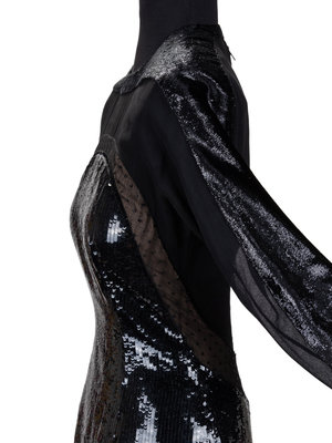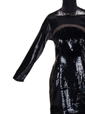 Black sequin dress with crew neckline, black sparkly velvet raglan long sleeves, black mesh front and back panel that extends to the underarm of the sleeve, and center back zipper closure.