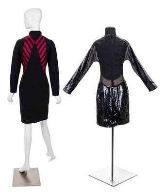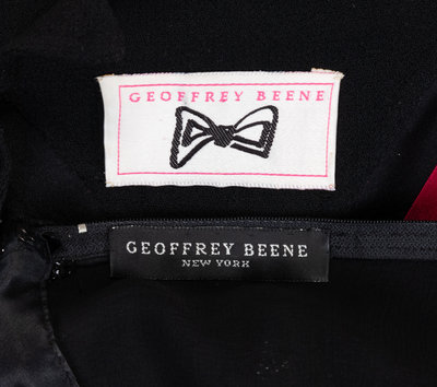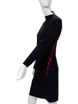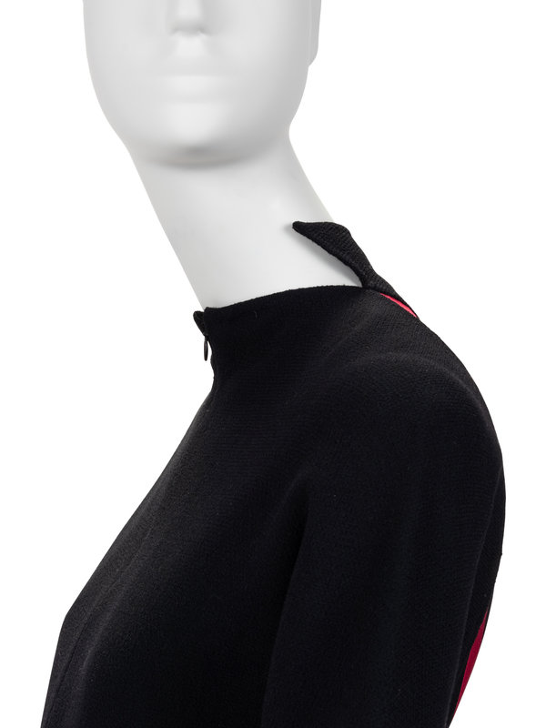 Black crepe long sleeve dress with peaked collar, black and red striped silk panels from the neckline to the hips, and invisible center back zipper closure.