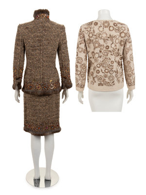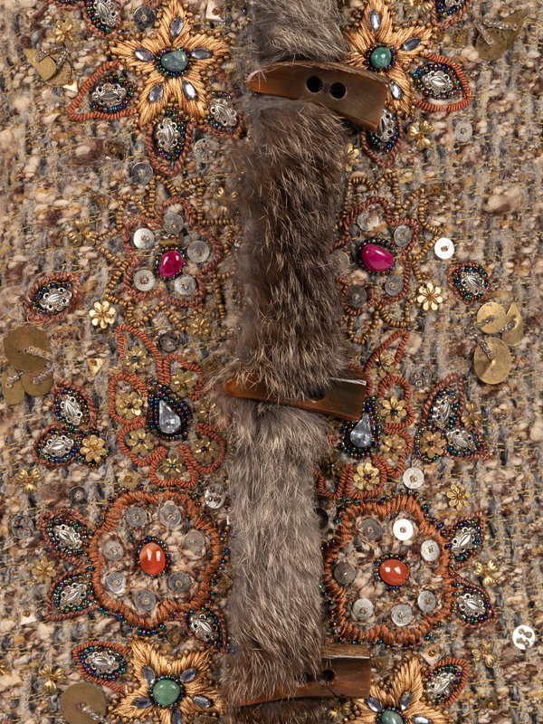 Brown wool blend tweed two-piece skirt ensemble including an embellished and embroidered jacket with beading along the neckline, front toggle button opening, sleeve cuffs, and hemline, and trimmed with rabbit fur; paired with matching skirt with left side zipper closure.