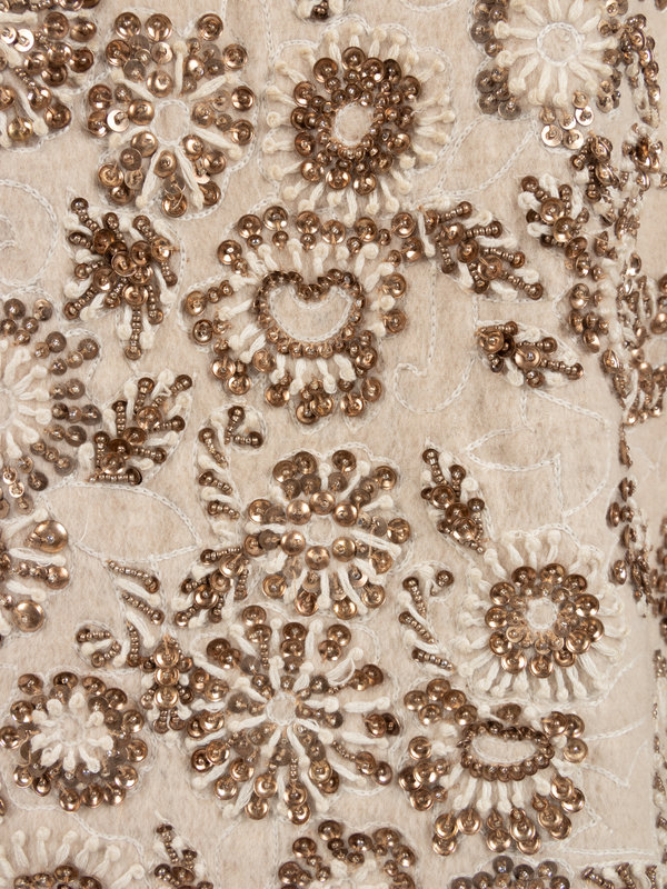 Light beige wool/angora blend jacket with embroidered brass sequins and glass beads, long sleeves, and front toggle button closure. Fall 2012.