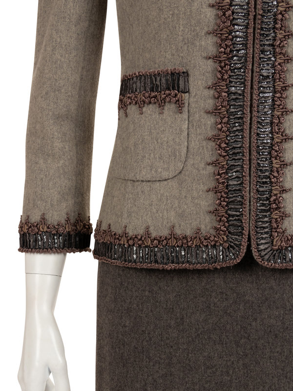 Brown Orylag/silk blend two-piece skirt ensemble with a embroidered single notch lapel jacket, long sleeves, and front hip patch pockets; paired with matching straight-fit skirt with left side zipper closure.