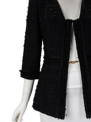Black tweed jacket with v-neckline, seam and vertical panel embellishment, set in long sleeves, and hook and eye and chain front closure. Spring 2010