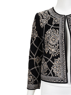 Black wool jacket with crew neckline, set in long sleeves, beaded and embroidered embellishments, and open front. Fall 2006