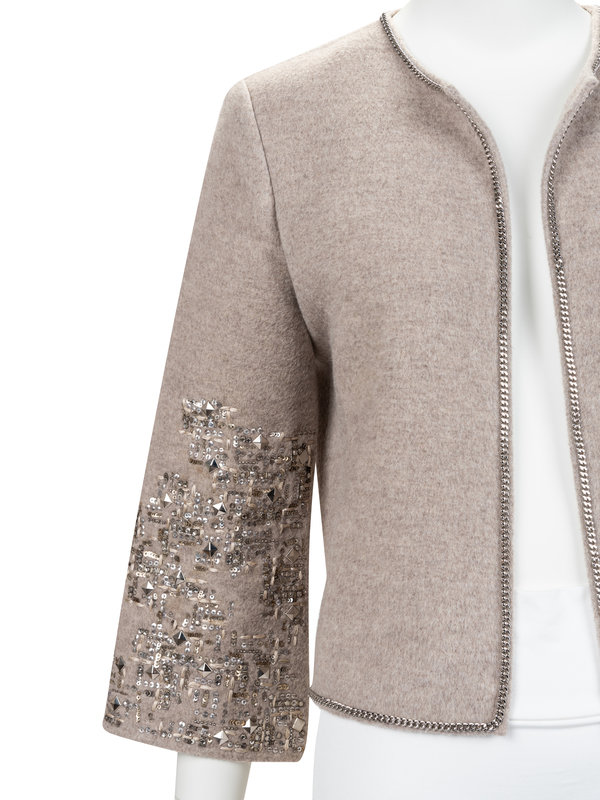 Grey wool jacket with crew neckline, set in long sleeves, a silver-tone chain trim, beaded embellishments on the sleeves, and an open front. Fall 2009