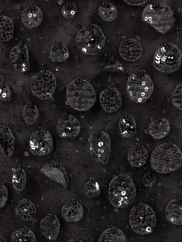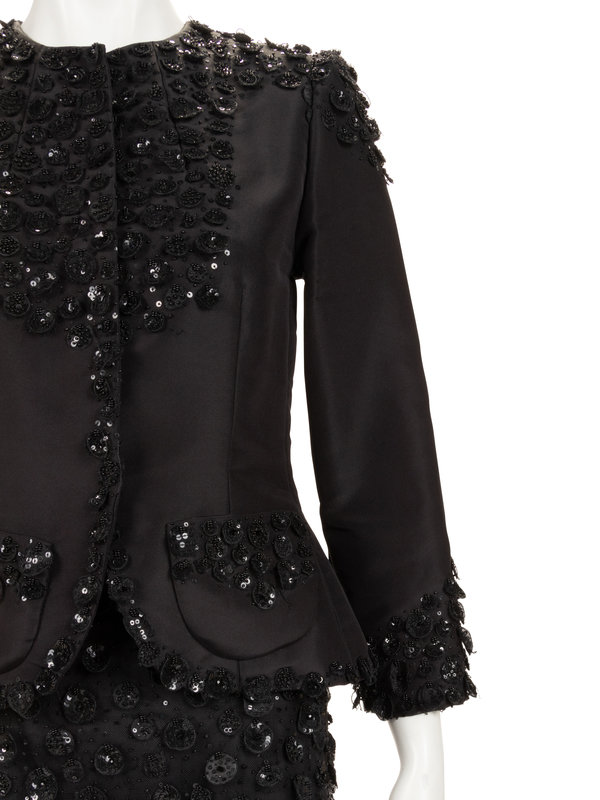 Black silk peplum style jacket with jewel neckline, set in long sleeves, two front patch pockets, black beaded and sequin embellishments, and front snap closure; paired with matching embellished skirt. Spring 2006