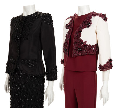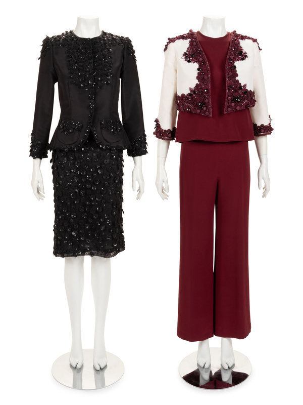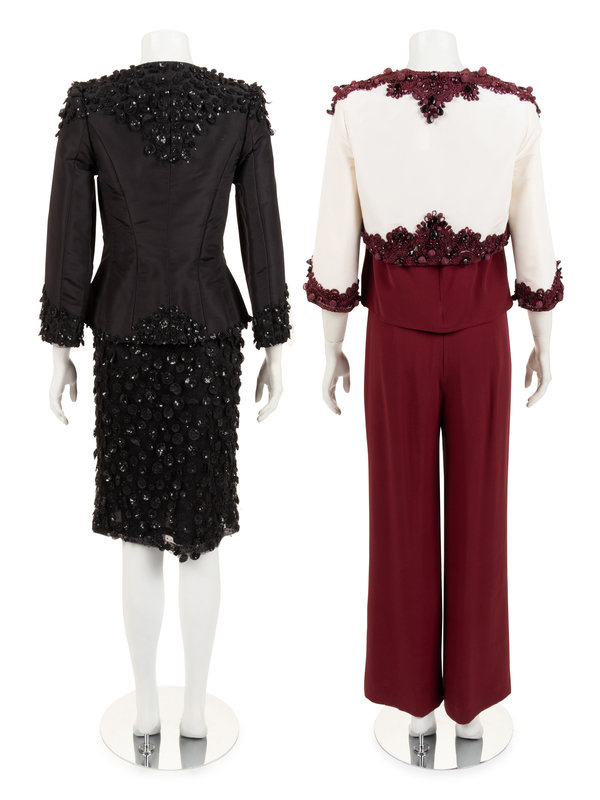 This lot includes two ensembles: one skirt suit and one three-piece pant suit.