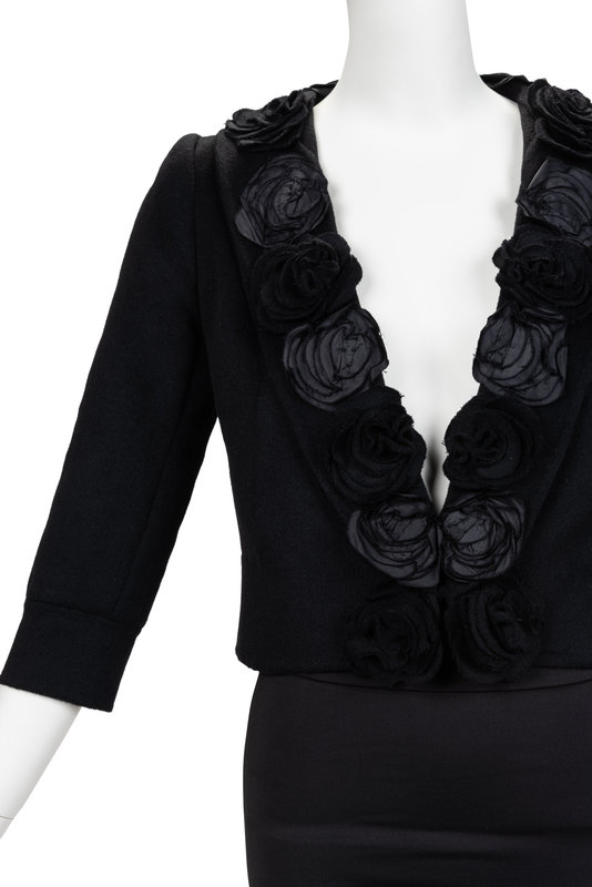 Black wool cropped jacket with black flower appliqued shawl lapel, set in long sleeves, and single hook and eye front closure.