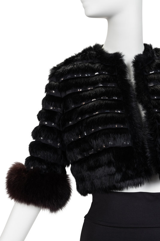 Black fur striped jacket with crew neckline, three quarter length sleeves with fur hem, stripes of mesh and beads, and open front.
