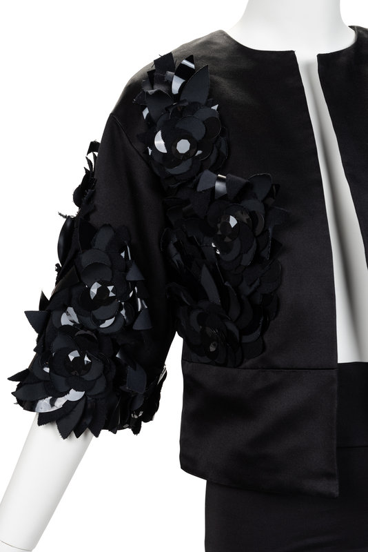 Black satin jacket with crew neckline, three quarter length sleeves, black flower applique, two front slit pockets, and open front.