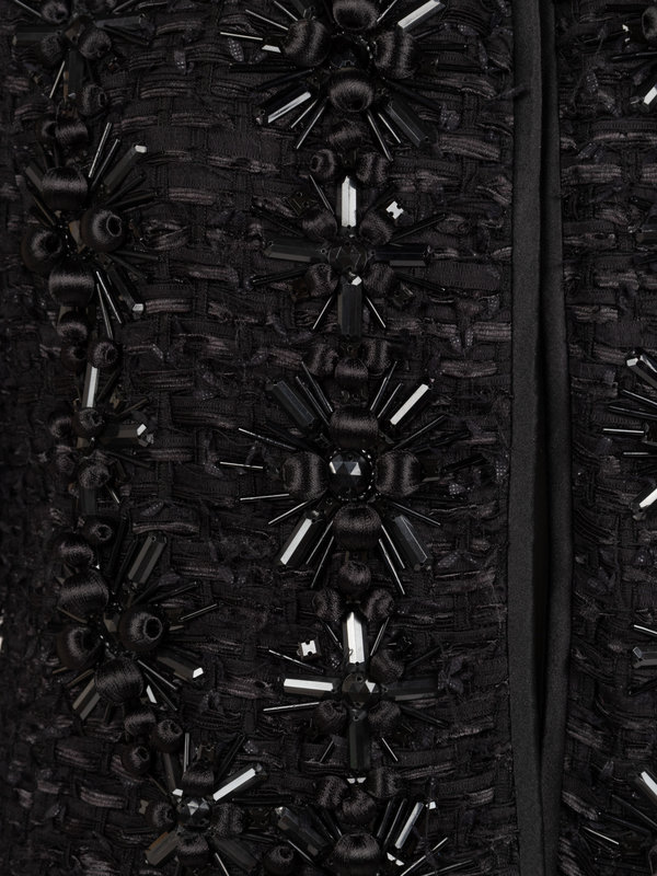 Black wool, nylon, and cotton blend woven jacket with jewel neckline, set in long sleeves, black beaded embellishments, and single hook and eye front closure; paired with matching woven skirt with tasseled hem. Fall 2010