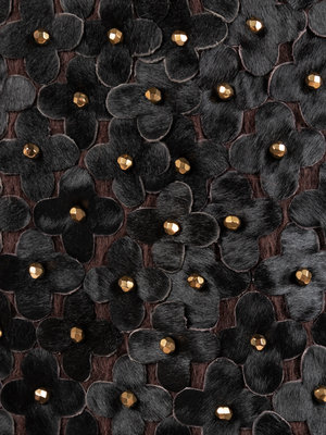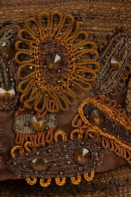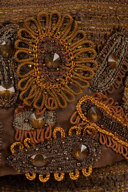 Brown lama and wool jacket with crew neckline, set in long sleeves, black flower with gold bead applique, and open front; paired with brown woven skirt with brown stitching detail. Jacket, Fall 2006