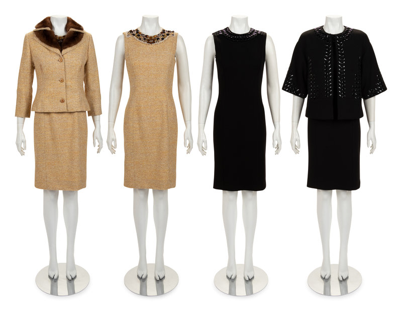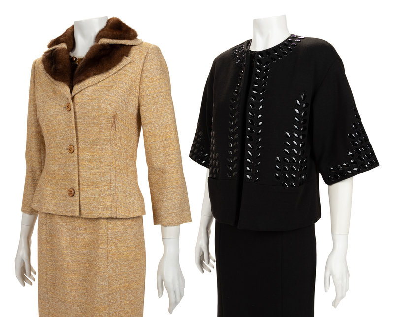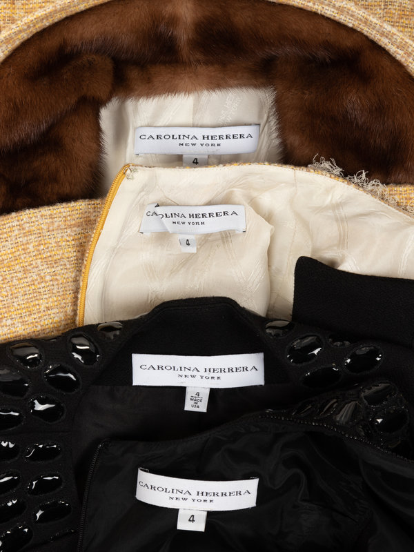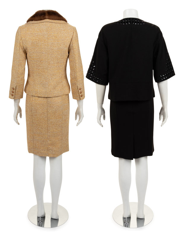Yellow wool and alpaca jacket with mink trim collar and lapel, set in long sleeves, top stitching detail, and front button closure; paired with matching sleeveless dress with brown beaded neckline embellishment.