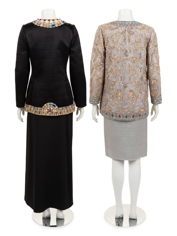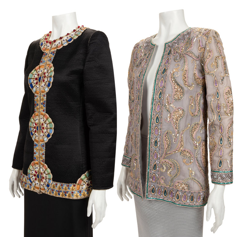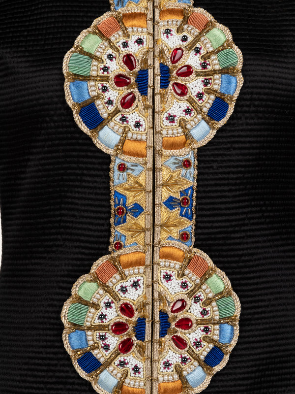 Black quilted jacket with crew neckline, set in long sleeves, multicolored embroidered and beaded trim, with hook and eye front closure; paired with black silk skirt