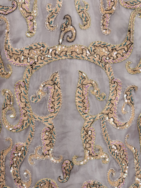 Grey woven jacket with jewel neckline, set in long sleeves, purple and blue embroidered paisley pattern with sequins, and an open front closure; paired with a grey quilted skirt.