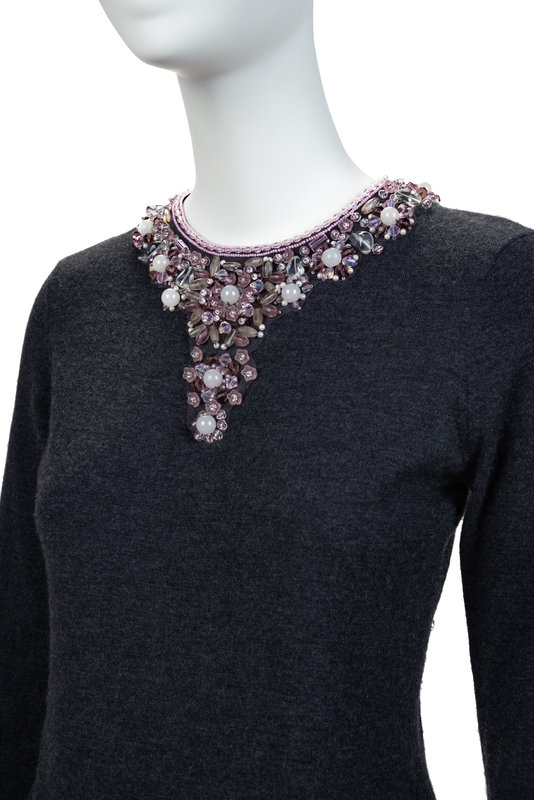 Grey cashmere knit top with crew neckline, set in long sleeves, pink and purple beaded embellishment around the neckline, and back zipper closure.