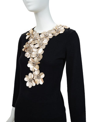 Black cashmere knit top with jewel neckline, set in long sleeves, gold flower applique around the neckline and center front, and back zipper closure.