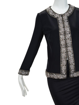 Black silk jacket with jewel neckline, set in long sleeves, silver-tone beaded embellishments along the trim, and hook and eye front closures.