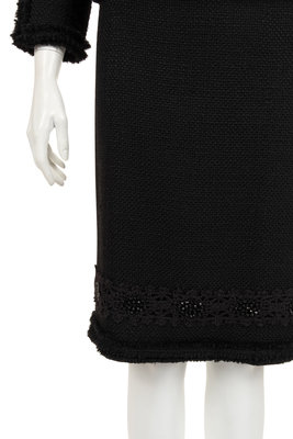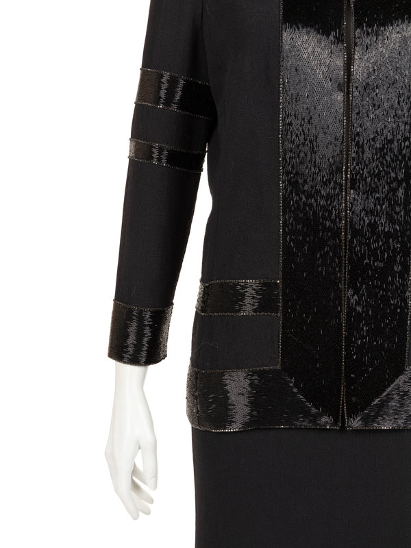 Black wool jacket with jewel neckline, set in long sleeves, black beaded trim and embellishment, with hook and eye front closure; paired with matching black wool skirt.