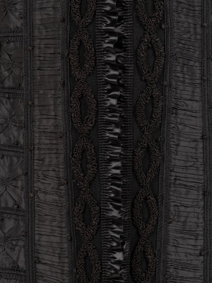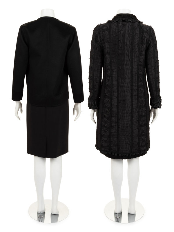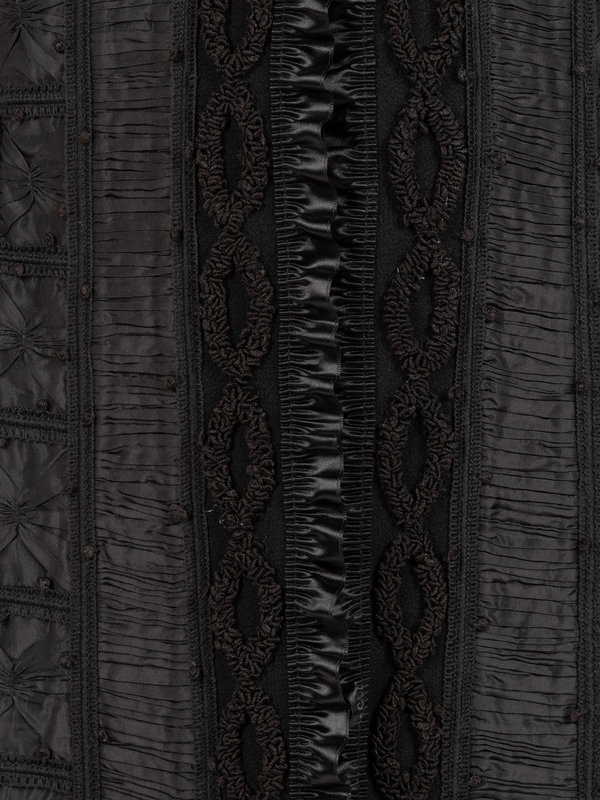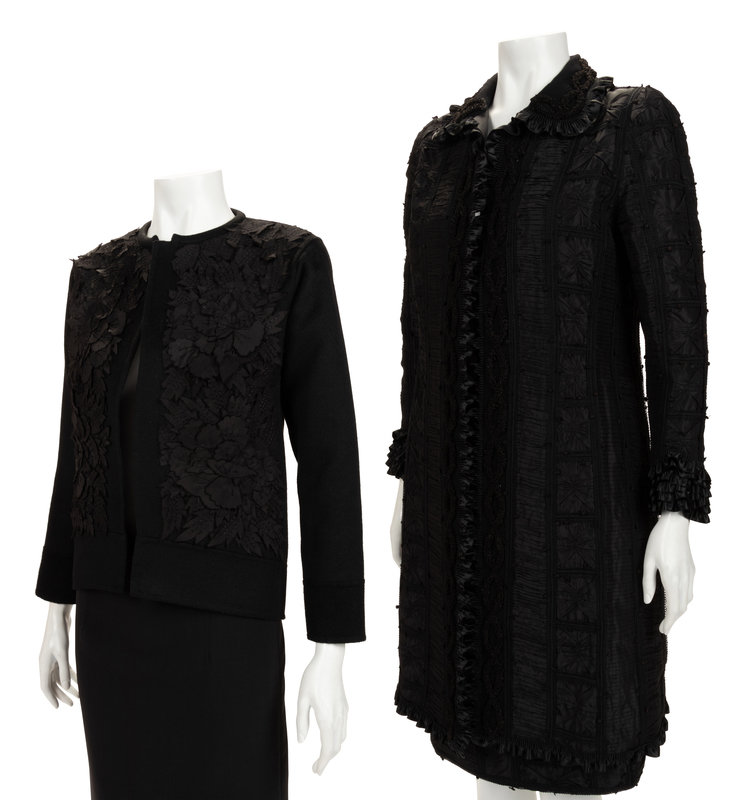 Black wool and silk pleated and ruched paneled jacket with rounded flat collar, crew neckline, set in long sleeves, ruffled trim, and open front; paired with matching pleated and ruched paneled skirt.