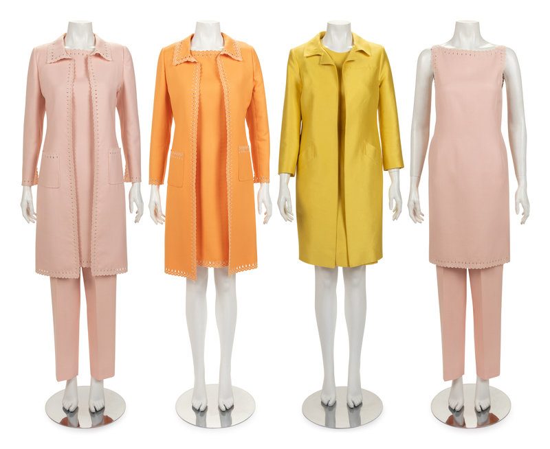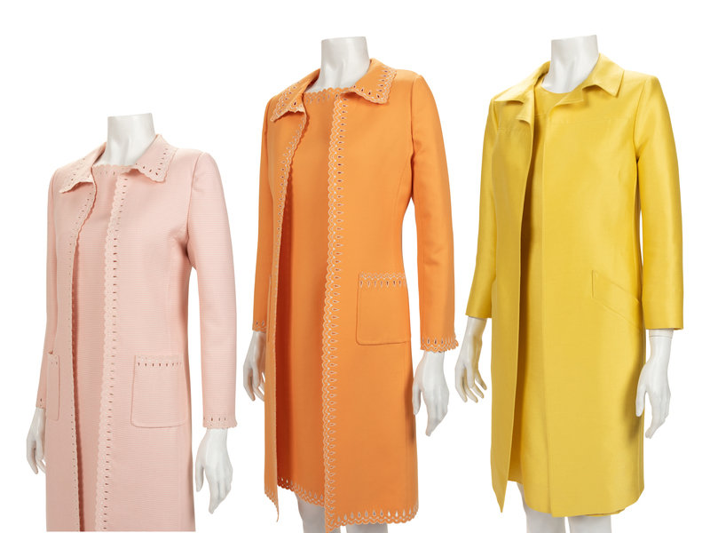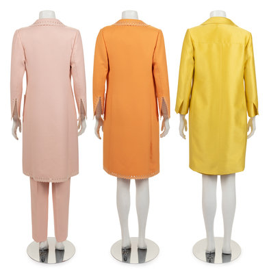 This lot includes three ensembles: two two-piece dress ensembles and one three-piece pant ensemble.
