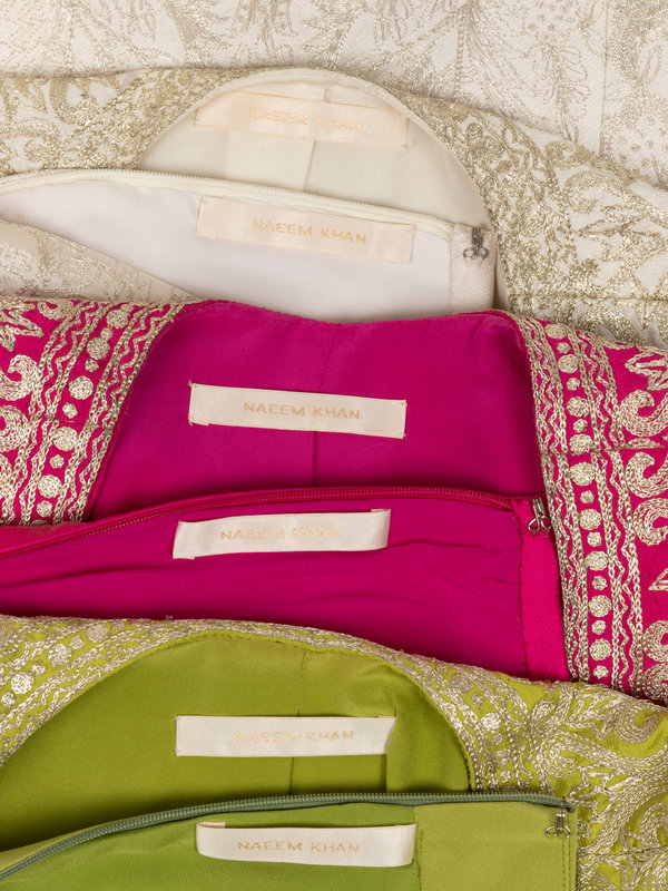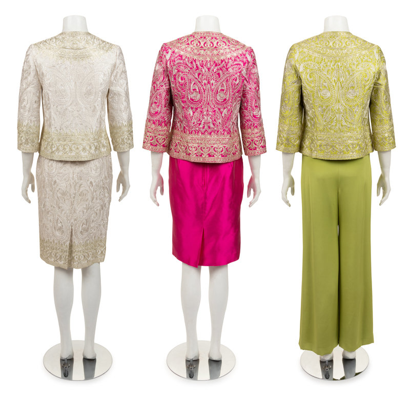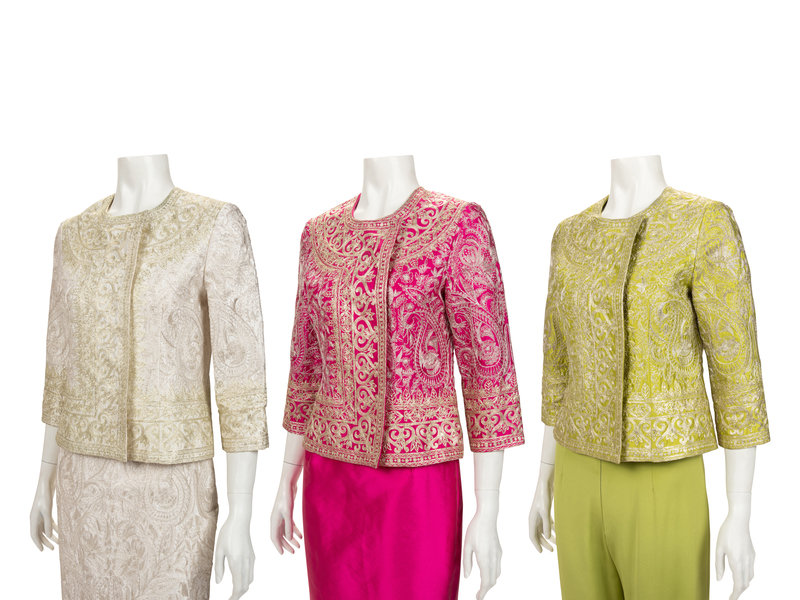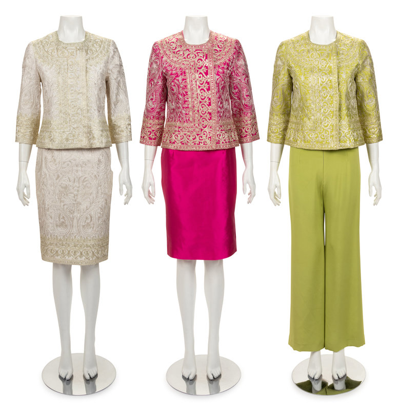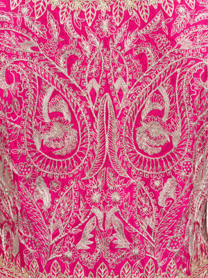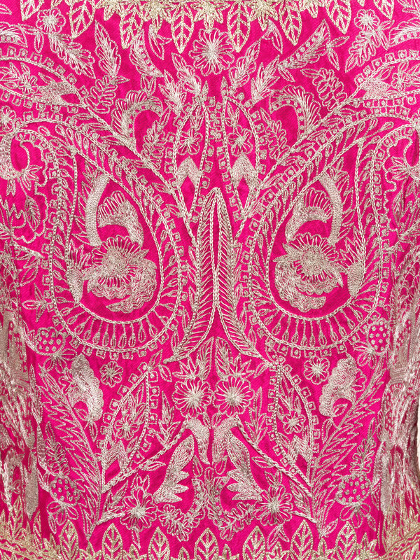 Pink silk jacket with jewel neckline, silver and gold tone thread embroidery throughout, set in long sleeves, asymmetrical opening with front snap closure; paired with matching pink silk skirt.