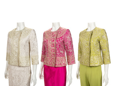 White silk jacket with jewel neckline, silver and gold tone thread embroidery throughout, set in long sleeves, asymmetrical opening with front snap closure; paired with matching white silk embroidered skirt.