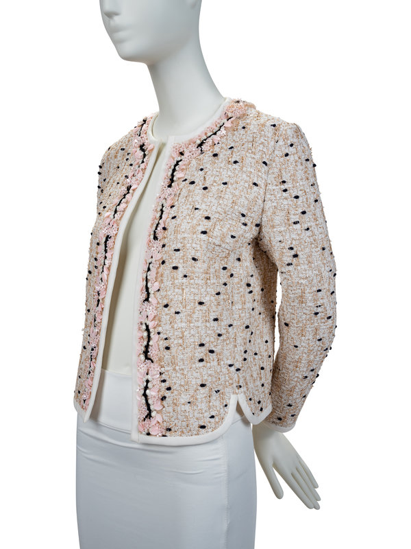 White, pink, and black cotton nylon blend specialty weave jacket with gold thread detail, crew neckline, set in long sleeves, pink and white embellished trim detail, and open front.