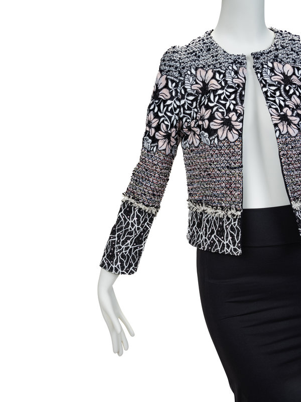 Black, white, and pink embroidered multipatterned jacket with crew neckline, set in long sleeves, and open front.